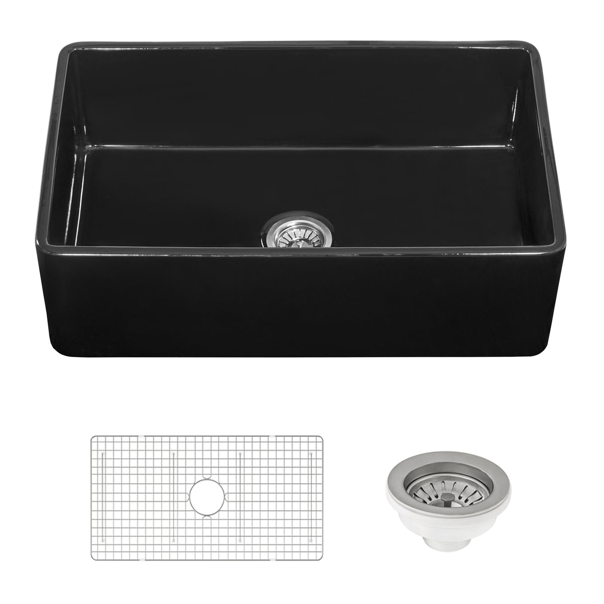 - INCLUDED IN BOX: Fireclay sink, bottom rinse grid, drain assembly, installation guide.