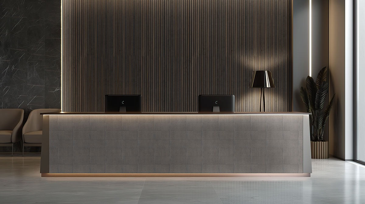 Embark on a journey to create tranquil retreats within your spaces with Umber Acoustic Wood Slat Wall Panels in dark brown. These wood wall panels, crafted from fluted wood, require no staining or sanding, offering an impeccable blend of elegance and practicality. Featuring a captivating arrangement of natural wood on a cutting-edge acoustic fiber pad, these acoustic wall panels deliver unmatched sound absorption without compromising sophistication. Tailored for living rooms, conference rooms, and office spaces, these adaptable panels transition between decorative accents and practical sound barriers, seamlessly enhancing interior decor. The streamlined installation involves easy screw-to-stud mounting, making them a preferred choice for homeowners and businesses seeking the perfect synthesis of aesthetics and acoustic performance. Each box includes 32 black screws for hassle-free setup.