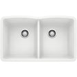 The BLANCO DIAMOND DOUBLE BOWL UNDERMOUNT KITCHEN SINK features a 50/50 bowl design, offering plenty of room for rinsing, washing, soaking, spraying and straining operations. The ideal choice for those who wash dishes by hand, you can stack dirty dishes and utensils in one sink while prepping in the other. This kitchen sink is made of SILGRANIT, a patented, certified granite composite material that is engineered to take on the toughest kitchen tasks. SILGRANIT is heat, scratch, stain, chip and impact resistant, making it stronger and more durable than other sink materials. Beautiful and highly functional with its non-porous, hygienic surface, it pushes away liquids and residue resulting in a low maintenance, easy to clean, long-lasting material. The DIAMOND double bowl kitchen sink easily conquers the demands of everyday life.