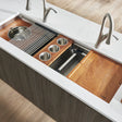 - Included in box: Sink, reversible cutting board/tray, wood platform with mixing bowl and colander attachments, 3-bowl condiment tray, rectangular stainless steel colander, foldable drying rack, bottom rinse grid, basket strainer drain, decorative drain cover, cut-out template and mounting brackets